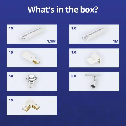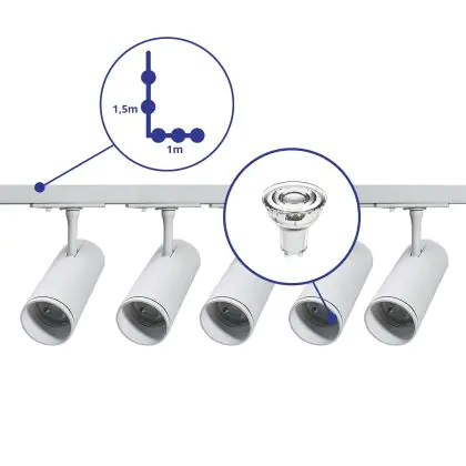 Descrizione Bright Choice Set completo 1-Fase Rail L 1 x 1,5 Metro Bianca | incl. 5x Faretti + GU10 2700K 3W Dimmerabile + Tappo Di Chiusura, Connettore di Alimentazione e L -Connettore