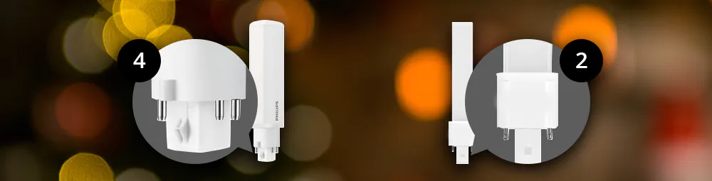 - Attacco: le lampadine LED PL-C possono avere attacco a 2 pin (G24d-1, G24d-2 o G24d-3) o a 4 pin (G24q-1, G24q-2 o G24q-3). Trova l’attacco giusto e sostituisci la tua lampadina PL-C con una a LED;