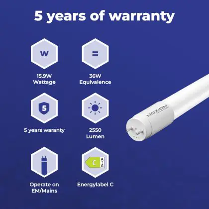 Il Noxion Tubo LED T8 Avant Extreme (EM/Mains) Ultra Output 15.9W 2550lm - 830 Luce Calda - | 120cm - Sostitutiva 36W è l’alternativa perfetta per il tubo fluorescente standard 36W nelle plafoniere con un reattore. Con questo tubo LED hai una garanzia di una vita media utile molto lunga e 5 anni Lampadadiretta.it di totale garanzia. .