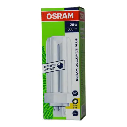 Le Osram DULUX T/E 26W/830 PLUS Lumilux Warm White sono lampade a basso consumo altamente efficienti caratterizzate da una vita media lunga e che emettono una luce di buona qualità. La base di queste lampade fluorescenti compatte é del tipo a 4 pin (perni). La potenza delle medesime é pari a 26W.