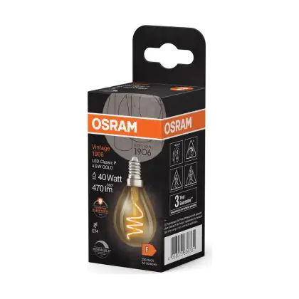 La lampada Osram Vintage 1906 LED Classic Slim E14 Pera Filamento Oro 4.9W 470lm - 922 Bianco Molto Caldo | Miglior Resa Cromatica - Dimmerabile - Sostitutiva 40W è il sostituto perfetto per le tue vecchie lampade 40W con attacco a vite piccolo E14 grazie alla sua tecnologia LED. Passare a LED ti offrirà molti vantaggi!