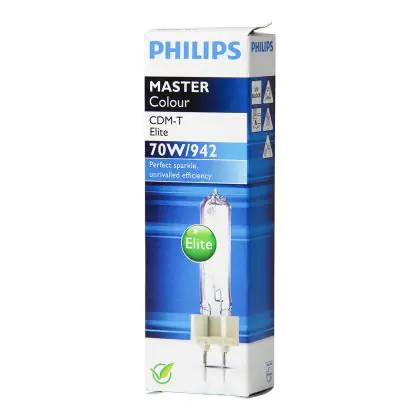 Le Philips CDM-T Elite 70W 942 G12 (MASTERColour) sono lampade a scarica compatte da 70W con attacco G12 che emettono una luce brillante assicurando colori stabili per tutto l'arco della loro vita, pari a 15.000 ore. Ció che le contraddistingue rispetto alle normali Philips CDM-T é la più lunga vita media e il più alto indice di resa cromatica pari a 90-100Ra che sta ad indicare un'ottimale esaltazione delle caratteristiche dell'oggetto illuminato. Da notare anche l'intensità del flusso luminoso che raggiunge un livello pari a 7500 lumen. Le Philips CDM-T Elite 70W 942 G12 (MASTERColour) integrano un filtro UV che consente di limitare fortemente lo scolorimento degli oggetti illuminati.